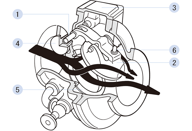 分解作業をする時は、図の③の上部カバーを開けるだけで、弁内部を全て点検可能。②の弁体を取り出して修理をする場合も、④のピンホルダーが軸方向に抜ける構造になっているため、左右2個のピンホルダーを抜き取るだけで、弁アームピンと弁体を一緒に取り出せます。